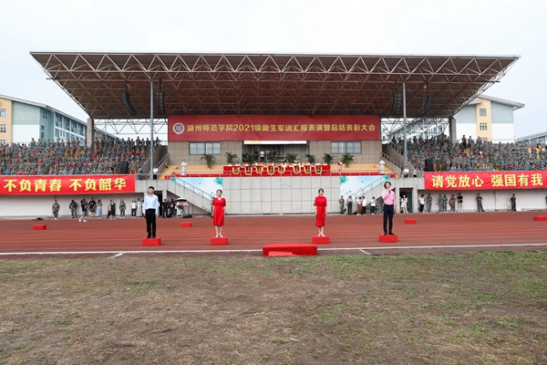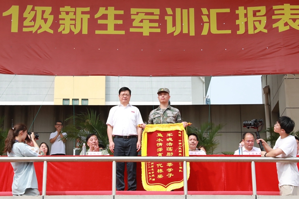 金佩华代表学校向承训部队表示感谢,向从事军训组织和保障工作的各位老师致以诚挚问候,向2021级全体新生表示祝贺。金佩华充分肯定同学们在军训过程中的出色表现,并提出三点希望:一是希望同学们尽快完成角色转换,适应大学生活;二是希望同学们尽快融入湖州师院,坚持以校为荣;三是希望同学们尽快厚植家国情怀,铭记使命担当。