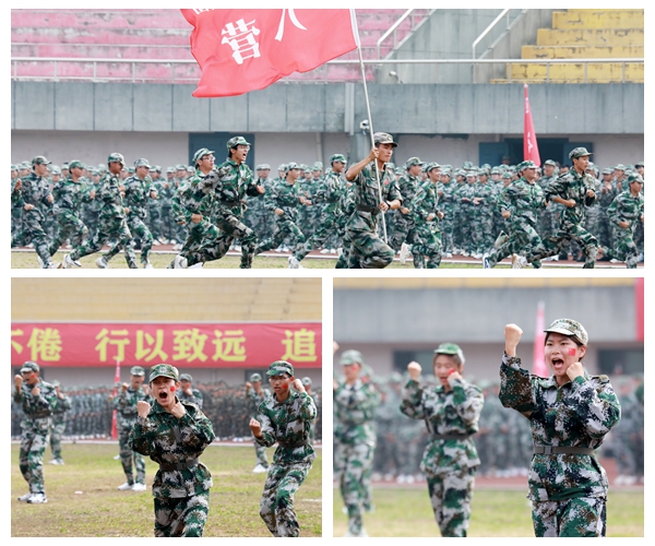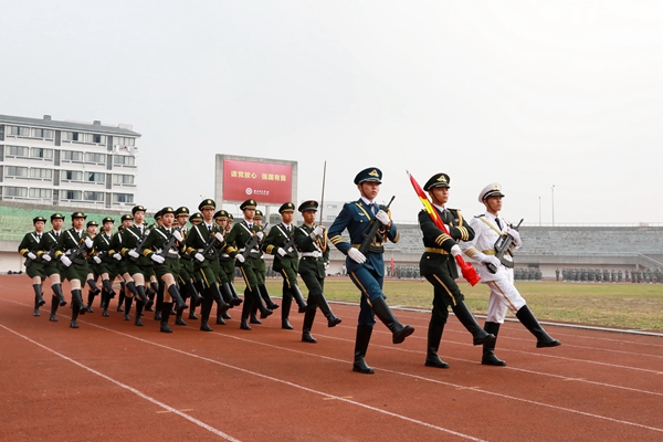 升国旗,奏国歌,行注目礼。运动场上五星红旗迎风飘扬,雄壮的国歌声振奋人心,军训汇报表演拉开帷幕。见习同学组成的合唱团学生用整齐嘹亮的歌声展现出当代青年学生的时代风采。“请党放心,强国有我…”铿锵有力的呼喊声此起彼伏,久久回荡在风雨操场。