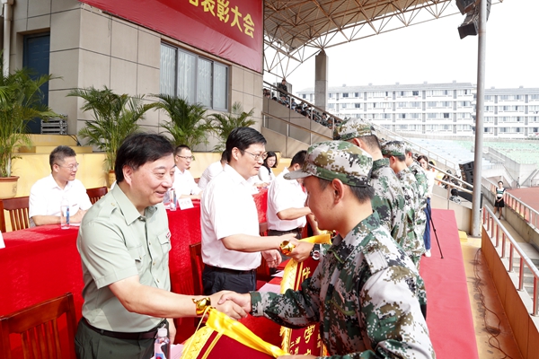 舒志定宣读军训表彰文件,主席台领导为军训先进集体和个人进行颁奖。