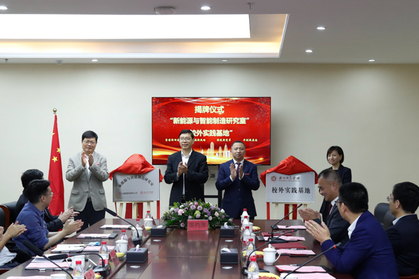 蒋云良和常清为“新能源与智能制造研究室”揭牌,工学院负责人和高银为“校外实践基地”揭牌。
