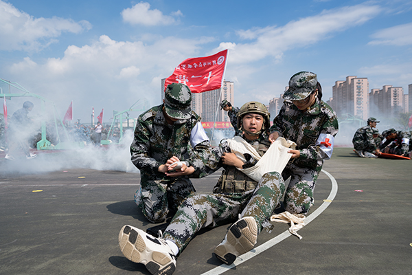 音乐学院文艺兵方阵表演了《音为有你·旗彩飞扬》,昂扬的青春,飞舞的红旗表达着新师院人对未来的期盼;体育学院捕俘拳方阵表演了《威武师院》,一招一式显神姿,一起一落展雄心;医学院/护理学院战地救护方阵用行动践行着医护工作者的铮铮誓言;队列方阵飒爽的军姿、整齐的步伐、响亮的口号,展示了本次军训的累累硕果。