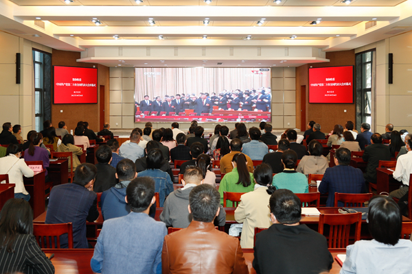 在明达楼,学校领导班子,机关科级以上干部以及民主党派、知联会、侨(留)联会代表集体收看了大会实况直播,认真聆听习近平总书记作的报告,深入了解把握过去五年和新时代十年的伟大变革以及党和国家事业未来发展蓝图,并就报告中的新提法、新思想进行探讨和交流,切实把握报告广度和深度,深刻领会报告内涵与意义。师生们认为,报告高屋建瓴、博大精深,内涵丰富、振奋人心,是我们党团结带领全国各族人民继续奋勇前进的政治宣言和行动纲领,反映了新时代发展要求,体现了人民热切期望。