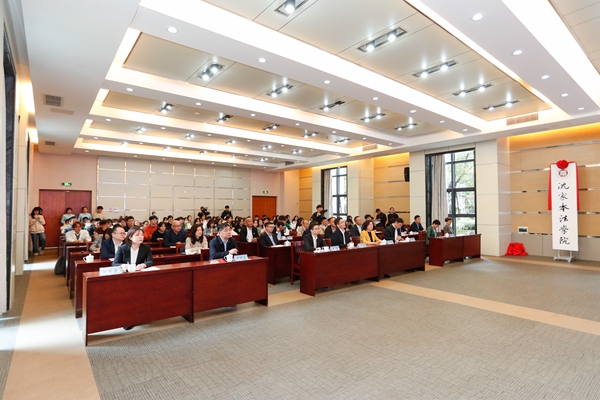 仪式上,蔡旭昶、喻运鑫、阮叶萍、金佩华、陈永华、舒志定共同为“沈家本法学院”揭牌。