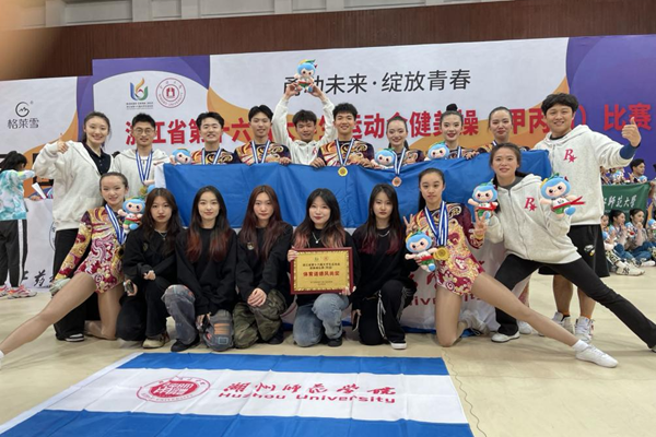近日,浙江省第十六届大学生运动会健美操(甲丙组)比赛在宁波大学举办。我校健美操队在教练唐鹏、赵一玥的带领下,以高超的技能,获3金1铜,创我校自参加该项赛事以来的最好成绩。学校还获“体育道德风尚奖”等荣誉称号。