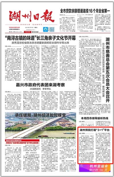 2023年5月10日,《湖州日报》头版报道我校聚焦湖州市八大新兴产业链和经济社会重大需求,聚合优势学科资源,打造“3+1”平台,以实际行动服务湖州高质量发展。链接如下: