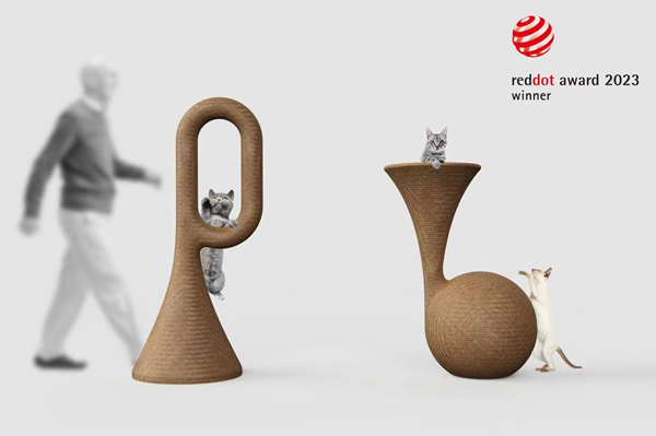 《Raise up》是一款猫爬架,旨在为生活带来活力和愉悦。对比市场上的猫爬架产品,该设计具有创新的实用功能,同时考虑了猫的玩耍需要和人的情感需求。产品的造型灵感来自号角和喇叭,个性化的音乐元素使产品增加了活力。RAISE UP提供了一种有趣的互动体验,帮助人们应对压力,增进身心健康。该成果是盛传新老师近三年钻研编织工艺的代表性实验作品,在行业中首次将藤编材料应用于猫爬架产品,该材料不仅具有自然与淡雅的特征,而且具有凉爽、耐抓和弹性的特点,非常适合宠物使用。据悉,目前该设计已量产。