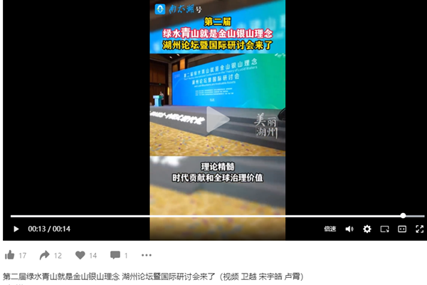 2023年7月7日,湖州发布报道由我校参与主办的第二届绿水青山就是金山银山理念湖州论坛暨国际研讨会在湖州安吉县举行。本届论坛主题为“八八战略”·“千万工程”·“两山”理念·中国式现代化,与会代表围绕生态文明建设、“两山”理念、绿色发展、碳达峰碳中和、生态治理现代化、生态产品价值实现等议题展开深入研讨。
