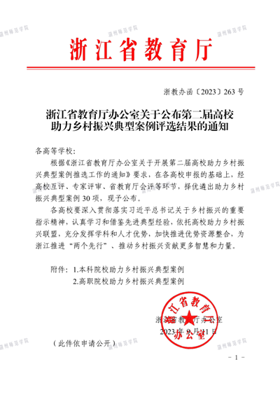 近日,浙江省教育厅公布了第二届高校助力乡村振兴典型案例评选结果。在各高校申报基础上,通过高校互评、专家评审,评选出本科、高职院校助力乡村振兴典型案例各15项,我校申报的《“共富渔歌”——初心谱写渔文章 党旗映红振兴路》成功入选。