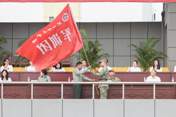 舒志定向军训团授旗,并宣布2023级学生军事训练正式开始。