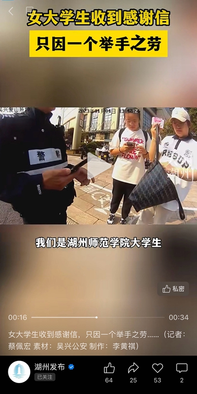2023年11月12日,湖州发布报道我校大学生收到感谢信。具体如下: