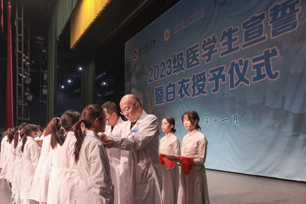 医学生宣誓暨白衣授予仪式是我校医学生职业素养教育及新生始业教育的重要内容,旨在让每一名医学生在入学之初铭记学医初心,树立学业目标,深化责任意识。接下来,医学院/护理学院还将深入开展“杏林讲坛”“南丁格尔大讲堂”“优医说”等教育活动,引领医学生在医术医德等方面全方位成长与发展。