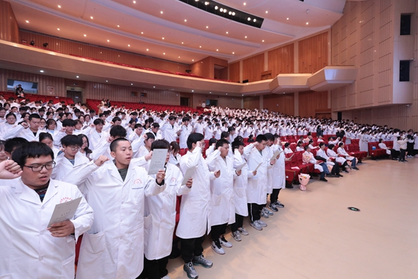 “健康所系,性命相托。当我步入神圣医学学府的时刻,谨庄严宣誓:我志愿献身医学,热爱祖国,忠于人民……”538名2023级新生身穿白衣,在姚韵靓院长的带领下庄严宣誓。