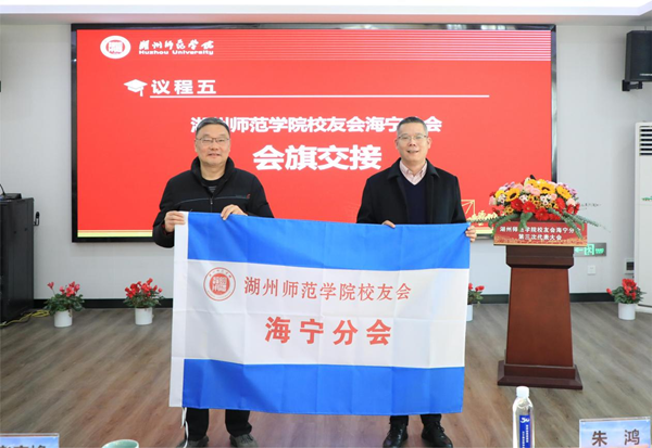 朱鸿宣读了第三届海宁分会组织机构成员建议名单。经全体与会校友审议,一致通过建议名单。李庆峰和朱鸿为海宁分会新一届组织机构成员颁发聘书。史丹夫与沈忠杰进行了会旗交接。