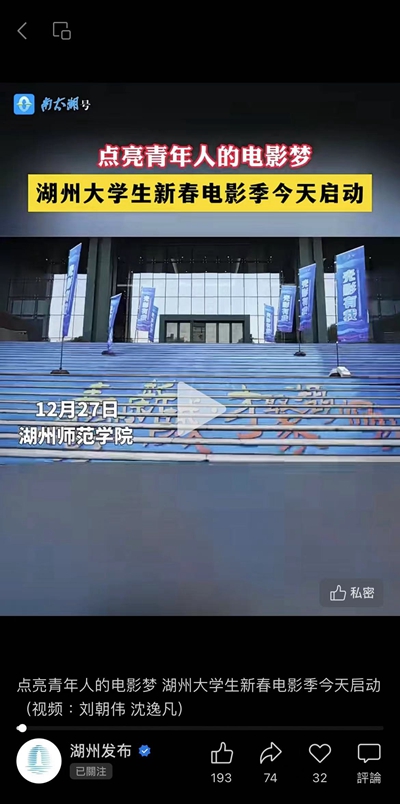 2023年12月28日,湖州发布报道我校联合承办湖州大学生新春电影季启动仪式。具体如下: