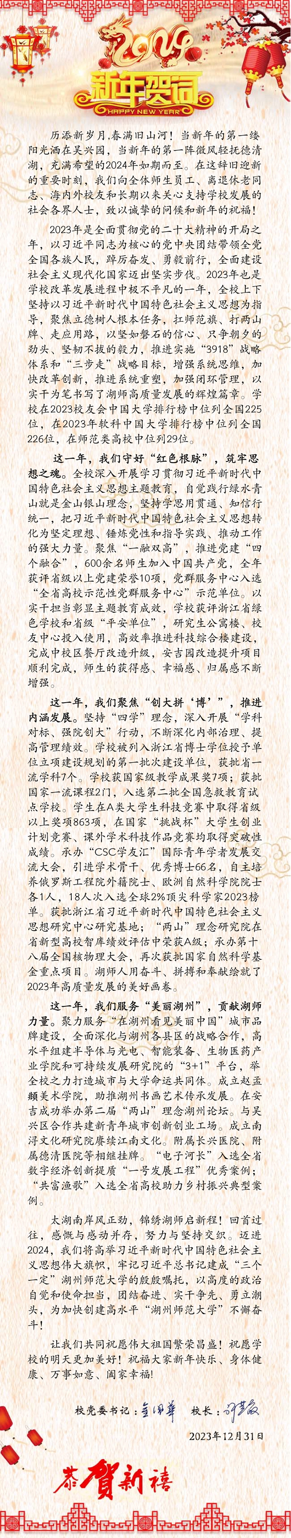历添新岁月,春满旧山河!当新年的第一缕阳光洒在吴兴园,当新年的第一阵微风轻抚德清湖,充满希望的2024年如期而至。在这辞旧迎新的重要时刻,我们向全体师生员工、离退休老同志、海内外校友和长期以来关心支持学校发展的社会各界人士,致以诚挚的问候和新年的祝福!