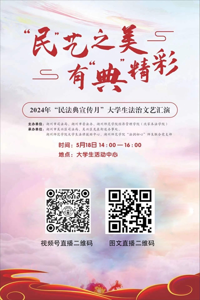 为弘扬社会主义法治精神,增强广大师生的法治意识,特举办“民”艺之美,有“典”精彩——2024年“民法典宣传月”大学生法治文艺汇演活动,欢迎广大师生参加。