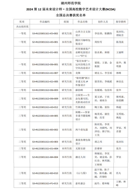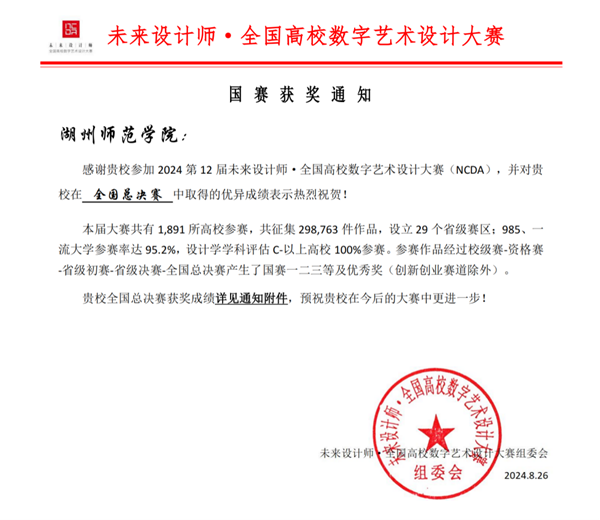 近日,2024年(第十二届)未来设计师·全国高校数字艺术设计大赛(NCDA)全国总决赛结果揭晓。我校学生获得国家级奖项16项,其中一等奖4项,二等奖4项,三等奖8项;获浙江赛区(省级)奖项99项,其中一等奖25项,二等奖30项,三等奖44项。教师组比赛,我校获得浙江赛区(省级)二等奖1项,三等奖1项。