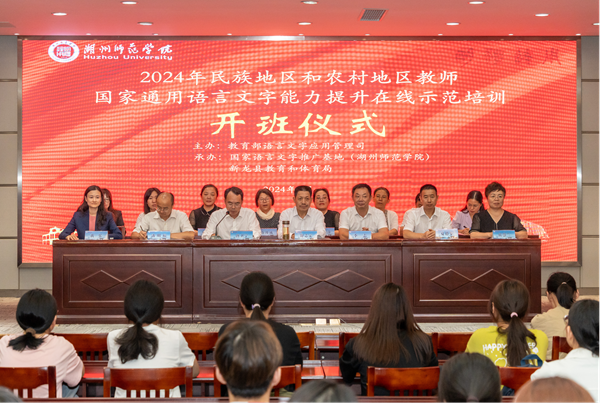 9月10日晚,由教育部语言文字应用管理司主办,我校国家语言文字推广基地、四川省新龙县教育和体育局联合承办的2024年民族地区和农村地区教师国家通用语言文字能力提升在线示范培训班开班仪式在我校举行。我校副校长、国家语言文字推广基地主任舒志定出席,教务处、人文社科处、人文学院、继续教育学院等相关部门和二级学院负责人,以及37名担任此次培训工作的教师和学生培训师参加。仪式通过线上同步直播,新龙县教育局副局长兰雪东、新龙县50名学员在线参加。