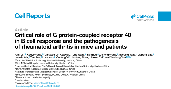 近日,我校医学院/护理学院及附属第一医院李安琪老师(第一作者),王霄一教授(共同第一作者),姚韵靓教授(通讯作者)以我校为第一单位在Cell知名子刊《Cell Reports》(中科院一区TOP,IF:7.5)上,发表题为 “Critical role of G protein-coupled receptor 40 in B cell response and the pathogenesis of rheumatoid arthritis in mice and patients” 的研究文章。附属第一医院、附属中心医院、第三人民医院的相关临床团队参与了项目研究。