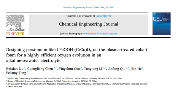 近日,我校工学院材料科学与工程系陈光良教授(通讯作者)团队以我校为第一单位在化工领域国际著名期刊《Chemical Engineering Journal》(中科院一区TOP,IF:13.3)上,发表题为“ Designing persimmon-liked FeOOH-(CrCo)Ox on the plasma-treated cobalt foam for a highly efficient oxygen evolution in an alkaline-seawater electrolyte”的研究文章。