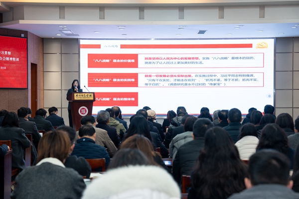 许慧霞作题为《找准发展坐标 弘扬“六干”精神 锻造高水平师范大学建设最强生力军》的主题报告,从激励干部担当作为,推动学校更具特色、更高水平、更有作为发展的角度,提出了三个“问一问”、三个“想一想”:一是打开视野想一想,回答好在全面深化改革的大时代中如何找准湖师的坐标系之问;二是结合自身来想一想,回答好在湖师高质量发展的坐标系中如何明确自己的坐标点之问;三是着眼未来想一想,回答好在找准坐标点之后,如何更加有效地融入学校赶超发展的新征程之问。
