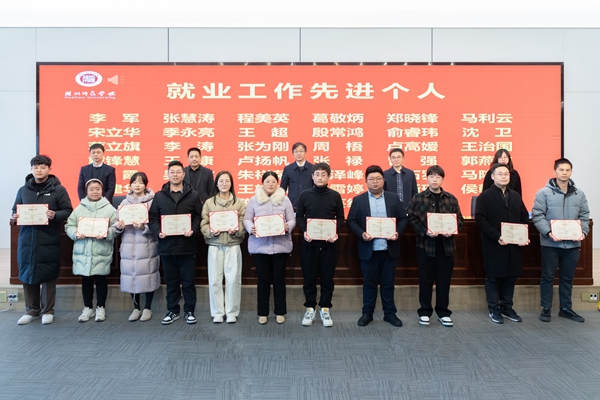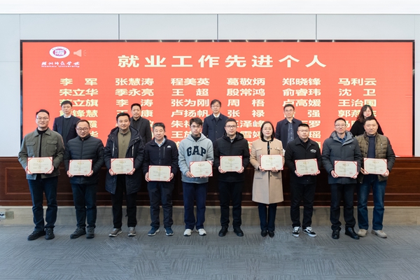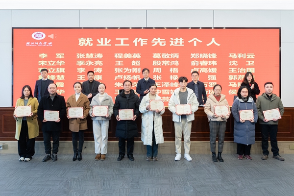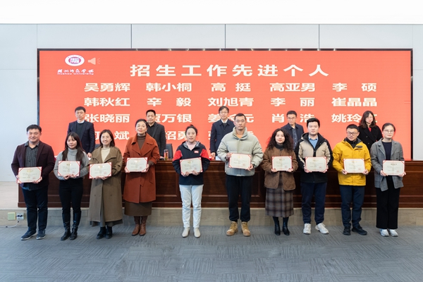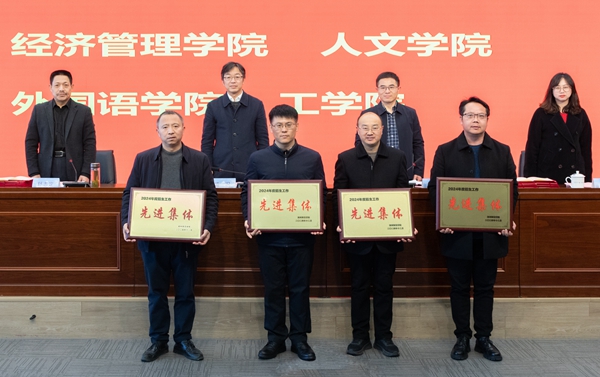 舒志定宣读表彰文件。经济管理学院、人文学院、外国语学院、工学院被评为2024年度招生工作先进集体;教育学院(教师教育学院)、体育学院、生命科学学院、医学院(护理学院)被评为2024年度就业工作先进集体;吴勇辉等18人被评为2024年度招生工作先进个人;李军等41人被评为2024年度就业工作先进个人。