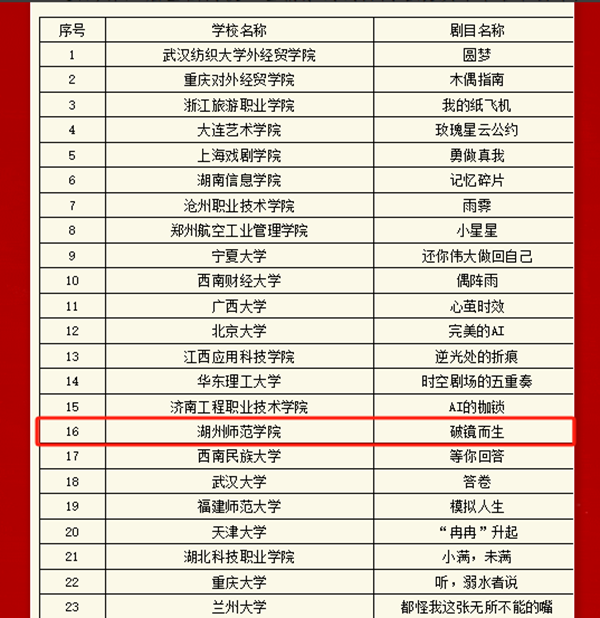近日,第八届全国高校心理情景剧剧目网络展演评审结果公布,我校原创心理情景剧作品《破镜而生》与北京大学、武汉大学、上海戏剧学院等30所高校和2所主办方院校作为“全国30强”剧目共同入围现场展演,实现了我校在该心理情景剧赛事上的名次新突破。