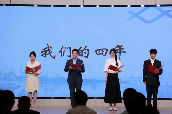 典礼在“我们的四年”诗朗诵中拉开序幕,俞则、胡逸雯、朱宸煜、沈钰丰四位同学用诗句串联起大学的回忆。胡家乐、严颖、王胜钊、朱哲凡四位同学以时间为线述说“安定·拾光”,讲述了在书院的蜕变历程。朱哲凡同学讲述了与导师之间的温情故事,吴凯同学的小提琴演奏《起风了》表达了对大学时光的不舍与留恋。音乐声中,毕业生们纷纷起身与相伴四年的领导与导师拥抱合影,将现场氛围推向高潮。