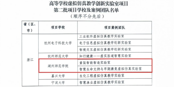 近日,教育部教育技术与资源发展中心公布全国高等学校虚拟仿真教学创新实验室第二批项目名单,我校艺术学院“童装智能智造实验室”、医学院(护理学院)“智慧生命支持与早期康复虚拟仿真实验室”项目成功获批。本次浙江省共有13所高校18个案例团队入选,这是我校首次获批教育部高等学校虚拟仿真教学创新实验室项目。