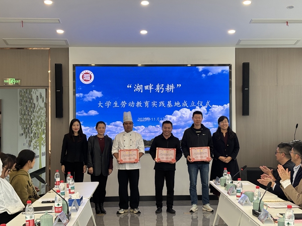 唐矛宁与沈健共同为“湖畔躬耕”大学生劳动教育实践基地揭牌。活动现场聘任四位劳育指导老师并颁发了聘书,与会师生围绕劳动教育工作展开深入探讨。