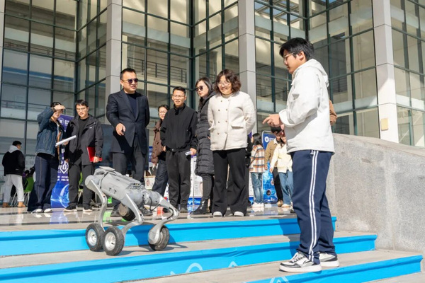 开幕式结束后,师生移步至31幢二楼平台,参观丰富多彩的AI科技互动展览。现场设有成果展区、实物展区与党建AIGC红色影像作品展。智能机器狗、采摘机器人、机械臂等设备一一亮相,学生负责人细致讲解研发过程与技术特点,引发热烈讨论。AI陪伴机器人展区也吸引了众多师生驻足互动,现场气氛活跃。