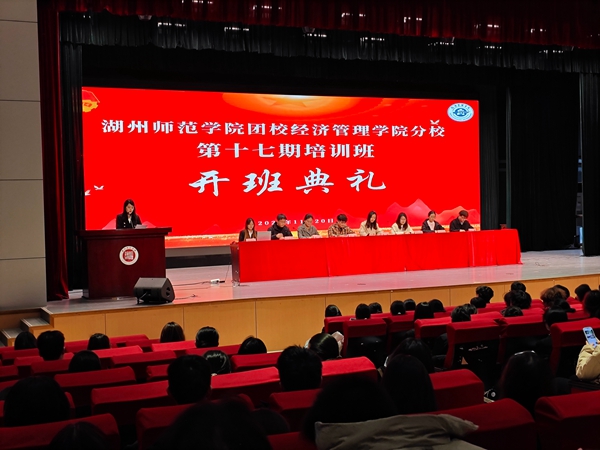 为进一步加强共青团思想建设,提高团员骨干的政治素质与理论修养 ,11月20日晚,经济管理学院第十七期团校开班典礼在大学生活动中心举行。经济管理学院党委副书记周颖,学工办副主任、团委书记沈佳艳,全体辅导员及学院近300名团校学员和团干部共同参加开班仪式。