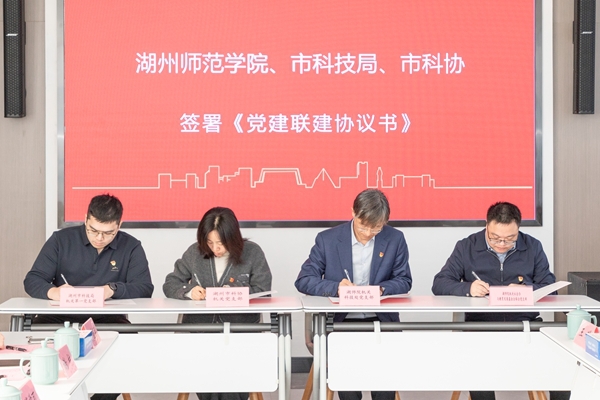 仪式上,我校机关科技处党支部、机关社会合作与发展联络办公室教育发展基金会联合党支部与湖州市科技局机关第一党支部、湖州市科协机关党支部共同签署《党建联建合作协议书》,标志着四方党建联建合作全面启动。李庆峰、夏阳、汪方华共同为湖州市首家高校“科学咖啡馆”揭牌。