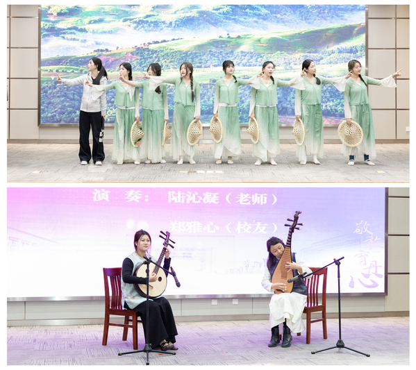 我校音乐学院教师颜铁军作词、崔伟作曲,学生演唱的音乐剧《诗画江南》为退休教职工们送上了美好祝福;陆沁凝老师和校友郑雅心带来的琵琶二重奏《送你一朵玫瑰花》饱含着对前辈的深情礼赞;退休教工合唱团唱响《待风来时》,以悠扬歌声诠释“等待”的开阔格局,传递出湖师人薪火相传、从容前行的力量。礼乐声声间,满含着学校对荣休教职工的真挚情谊。