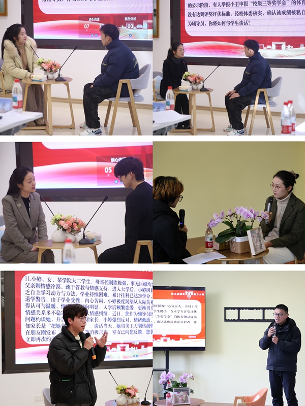 谈心谈话环节中,辅导员聚焦学生思想困惑、成长难题等真实场景,与学生展开深度沟通。他们精准把握学生成长规律,以共情倾听心声,用专业疏导困扰,让每一次交流都成为有温度、有深度、有力度的育人实践。助演学生由衷感言:“辅导员老师的专业素养与赤诚用心,让我们真切感受到了成长路上的温暖陪伴与坚实指引。”