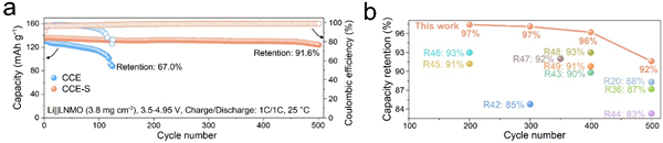 该论文提出了一种新型双功能电解质添加剂——1-氯甲基-4-氟-1,4-二叠氮双环[2.2.2]辛烷双四氟硼酸盐(Selectfluor),其包含氟硼酸盐阴离子(BF4)和一种独特的铵阳离子(简写为[Cl-F-DA]2+)。氟硼酸盐阴离子在 LNMO 阴极优先氧化,在锂阳极还原,形成富含电子阻挡氟化锂和离子导电LiBO2的界面。而且与传统添加剂不同,Selectfluor还能有效调节溶剂化结构。氟硼酸盐阴离子直接与Li+配位并促进阴离子衍生界面的形成,而[Cl-F-DA]2+阳离子则与Li+竞争并静电吸引游离溶剂,从而减少溶剂配位。在电解质中添加1% Selectfluor的Li|| LNMO 全电池在500次循环后保持91.6%的容量,远超对照样(125次循环后为67.0%)。该策略为设计高压电解质和加速 LNMO 商业化提供了关键见解。