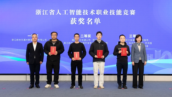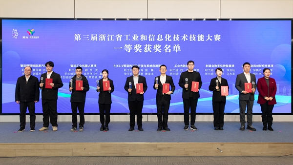 会上举行了浙江省工业和信息化技术技能大赛和浙江省人工智能技术职业技能竞赛颁奖仪式,王忠民、许慧霞和相关领导为获奖选手颁奖。