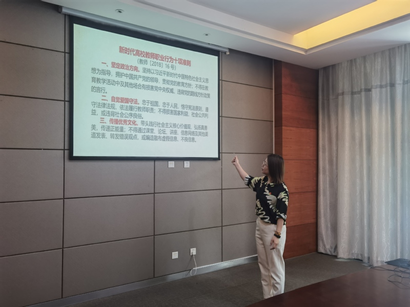 沈卫还为全体党员上了一堂主题为“加强师德师风提升职业道德”党课,她带领大家学习《教育部关于高校教师师德失范行为处理的指导意见》、《高等学校教师职业道德规范》和《新时代高校教师职业行为十项准则》等文件精神,结合违反教师职业道德的典型案例,要求全体党员要筑牢思想防线,恪守职业道德,以案为鉴,严明纪律要求,时刻做到自重、自省、自警、自励,加强自我反思,规范职业言行,守牢师德底线。