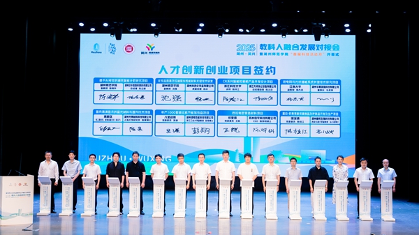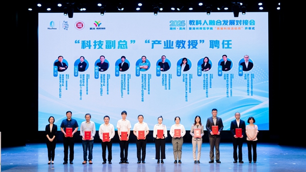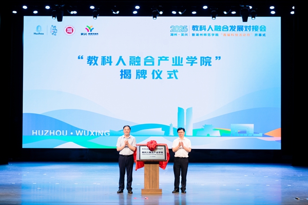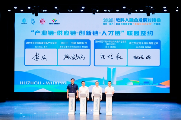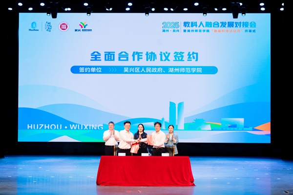 学校与吴兴区人民政府签署全面合作协议,揭牌共建“教科人融合产业学院”,并完成“四链”联盟签约、人才项目签约及“科技副总”“产业教授”聘任仪式。