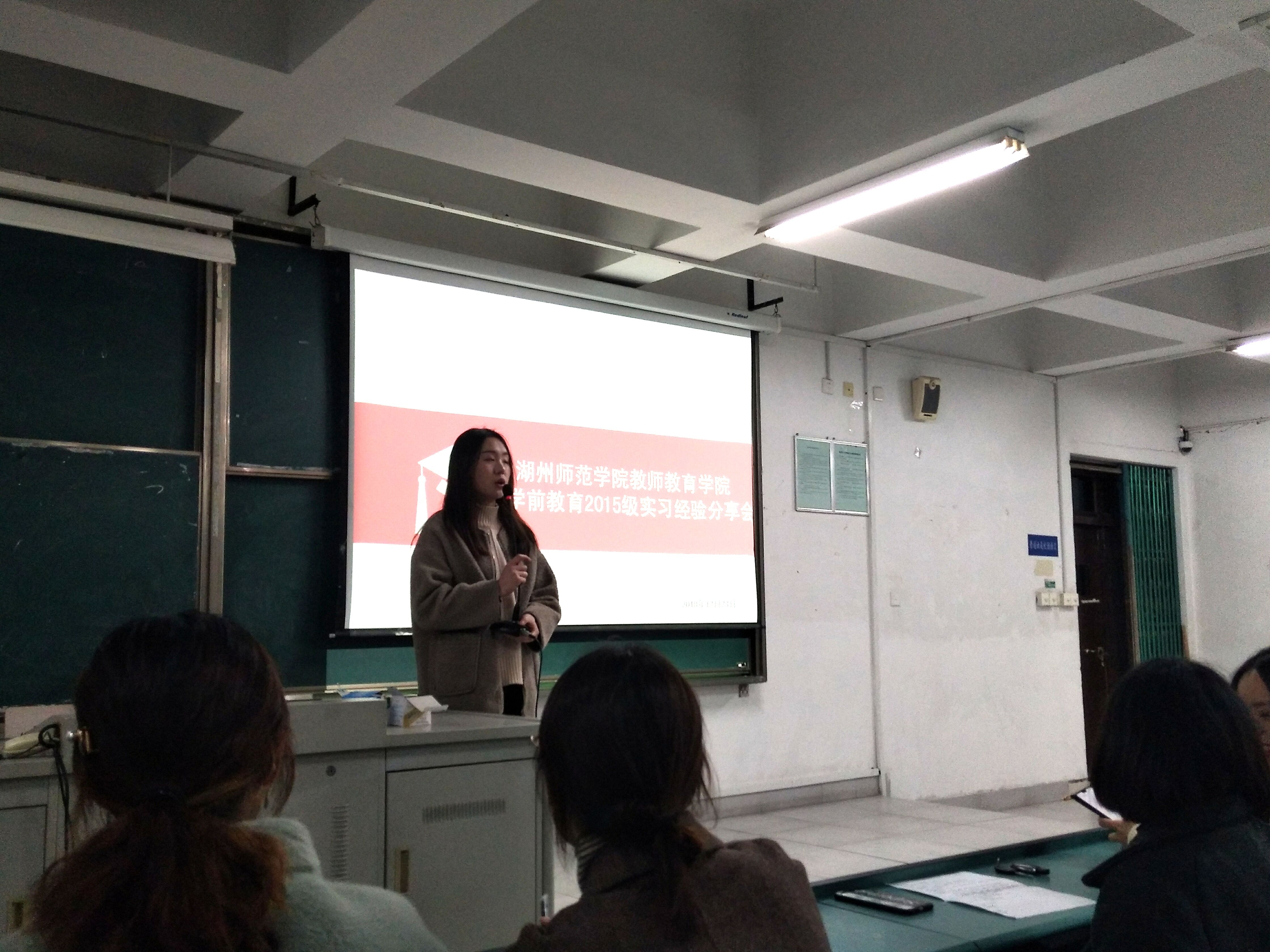 2018年 12月23日晚18:30,学前教育专业“小荷综艺团”社团组织教师教育学院学前教育2015级实习经验分享会,在12幢教学楼215教室组织卢丹凤等6名实习返校生与2016、2017和2018级学前教育专业学生做了精彩深刻的实习经验交流与分享。