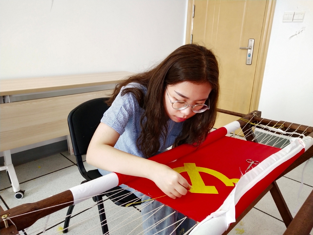 叶琴铭是小学教育专业大三学生,是党支部一名预备党员,她说:“我是在学校《中国传统刺绣赏析》课程上,在老师的组织下参加的‘献礼建党百年 百名师生绣党旗’活动的,我是一名党员,除了践行党员的义务,在建党百年之际通过一针一线绣一面党旗进行献礼让我感到荣幸,同时也感怀党和无数革面前辈的伟大和恩泽。”任家慧是小学教育专业大一学生,这个学期刚刚成为一名入党积极分子列入考察,她说:“刚入学的时候我就向党组织递交了入党申请书,积极参加党组织活动,我很荣幸能被党组织列为考察对象,绣一面党旗为建党百年献礼,这一针一线代表了我们青年学生用实际行动践行感党恩、跟党走。”