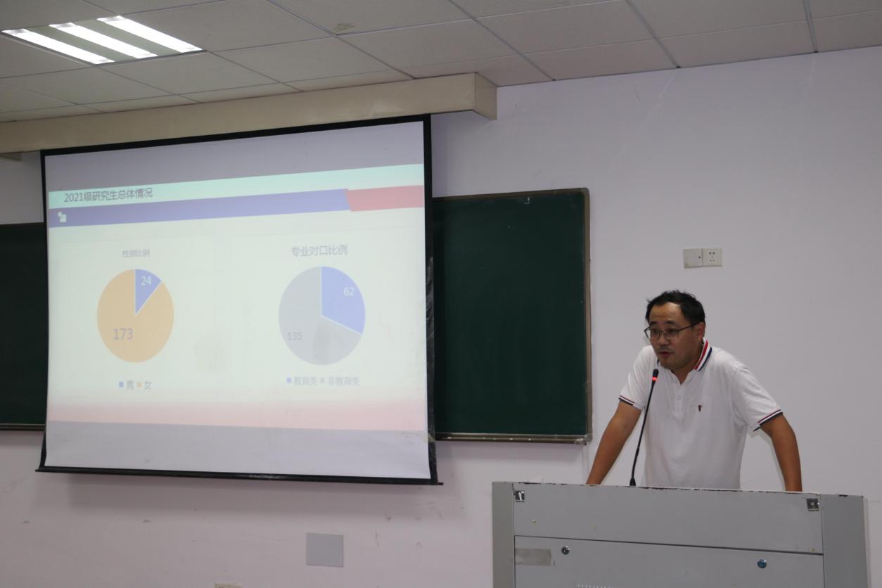 会上,学院学位与研究生工作办公室负责人钱乾老师代表教师教育学院对全体研究生新生表示热烈的欢迎,他介绍了教师教育学院的基本情况。为增强同学们对研究生生活的了解和认识,他着重介绍了研究生培养时间表,为新生分析研究生三年重要的时间节点,督促同学们扎实专业知识、提高自身素养。