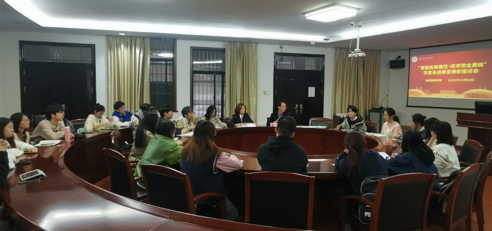 10月26日下午,教师教育学院在11-111会议室召开“发扬先锋模范·筑牢安全底线”学生先进典型表彰座谈会,对20200213班周泽人、20210214班周纯宇两名同学在坚决防范和抵御意识形态风险向高校渗透方面的突出表现进行表彰。学院党委书记何阅雄,班主任代表、辅导员代表、2022级各班班长参加本次座谈会。学院党委副书记朱竞主持会议。