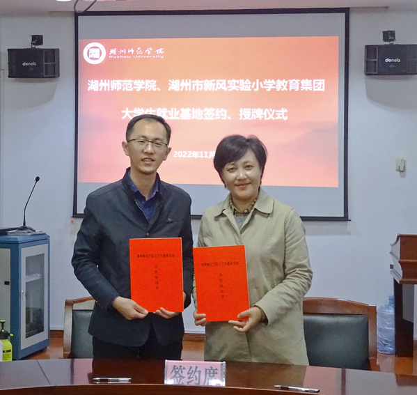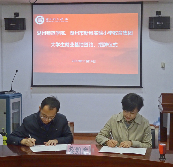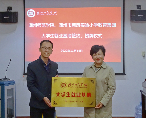 为进一步做好2023届毕业生就业工作,服务地方教育事业发展,11月14日下午,我院党委副书记朱竞,党委委员、小学教育系主任王燕红,小学教育系教师党支部书记刘佳,青年博士沈茜、张宗倩,学生就业负责老师陈俊宏,团学负责老师吴霜与湖州市新风实验小学教育集团举行大学生就业基地签约授牌仪式,湖州市新风实验小学校长邓承敏,德育处主任杨月飞参与仪式。