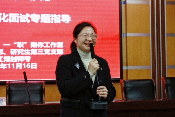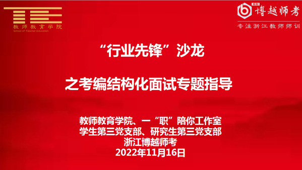 为深入践行党的二十大“科教兴国”战略,促进毕业生就业,2022年11月16日晚18:30,教师教育学院、一“职”陪你工作室、学生第三党支部和研究生第三党支部于中校区10-512开展“行业先锋”沙龙之考编结构化面试专题指导活动,由学院负责学生就业老师主持,邀请专业指导教师李旎为学生答疑解惑,2023届毕业生通过线上线下形式参加讲座,本次活动由浙江博越师考支持。