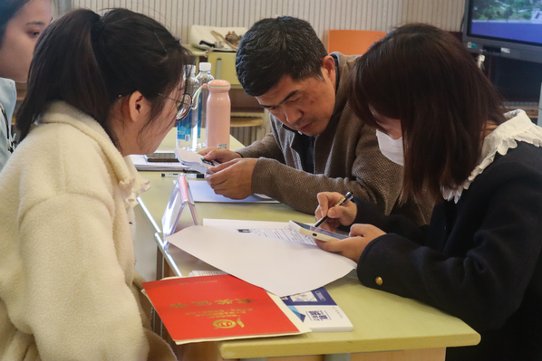 随后,应聘学生向安吉技师学院负责人提交个人简历及教师资格证等材料,并对课业成绩、大学经历、所获荣誉等进行简要汇报。应聘学生递交报名材料后,安吉技师学院负责人与报名应聘学生就校园经历、荣誉奖项方面进行交流,并作为择优选拔面试对象的参考条件。