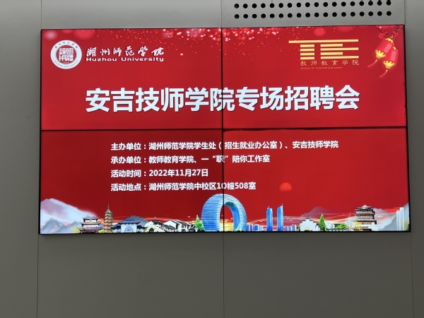 为深入落实“就业优先战略”,优化地方职业教育供给结构,11月27日,教师教育学院、一“职”陪你工作室于中校区10幢举办安吉技师学院专场招聘会,招聘岗位包括语文、数学、政治、机械、计算机等职业教育事业编制教师。