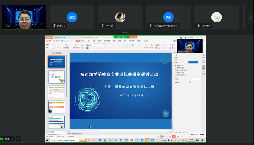 跨越千里,云端相聚,汇集智慧,同心同行。2022年11月29月晚上19:00,由岳慧兰教授主持,优米app怎么下载软件学前系教师、阿克苏教育学院学前系教师、和田师范专业学校教师们共同参与,开启了东西部学前教育专业虚拟教研室的第一次教研活动。活动以“课程教学大纲的撰写与实施”为主题,邀请了优米app怎么下载软件理学院唐矛宁教授、优米app怎么下载软件学前系主任王云霞副教授做了分享报告,并就教研内容进行现场提问与答疑。