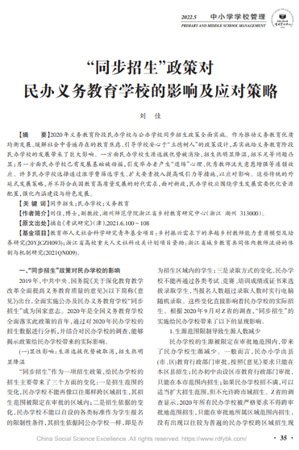 《“同步招生”政策对民办义务教育学校的影响及应对策略》指出:同步招生政策全面实施,一方面民办学校生源选拔优势被消除,招生热明显降温,招不足等问题凸显;另一方面民办学校已有发展基础被动摇,引发举办者产生“退场”心理、优秀教师流失意愿增强等连锁效应。许多民办学校选择通过涨学费筛选学生、扩大要素投入提高吸引等措施,以应对影响。这些传统的外延式发展策略,并不符合我国教育高质量发展的时代需求,面对新政,民办学校应围绕学生发展需要优化资源配置,强化内涵建设与特色发展。