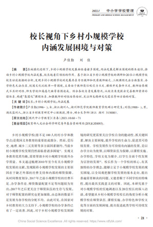 《校长视角下乡村小规模学校内涵发展困境与对策》指出:乡村小规模学校的发展存在专任教师和优质教师缺乏、三级课程无法全面落实、办学特色无法凸显、校园文化比较单一等困境,主要由于教师岗位吸引力不足、课程开发条件不足、教师培养模式不具针对性、师生学校归属感欠缺等原因造成。并从校长角度提出完善教师资源补偿体系、构建“集团化”课程体系、加强教师针对性培养培训、关注师生精神文化需求等四方面对策。